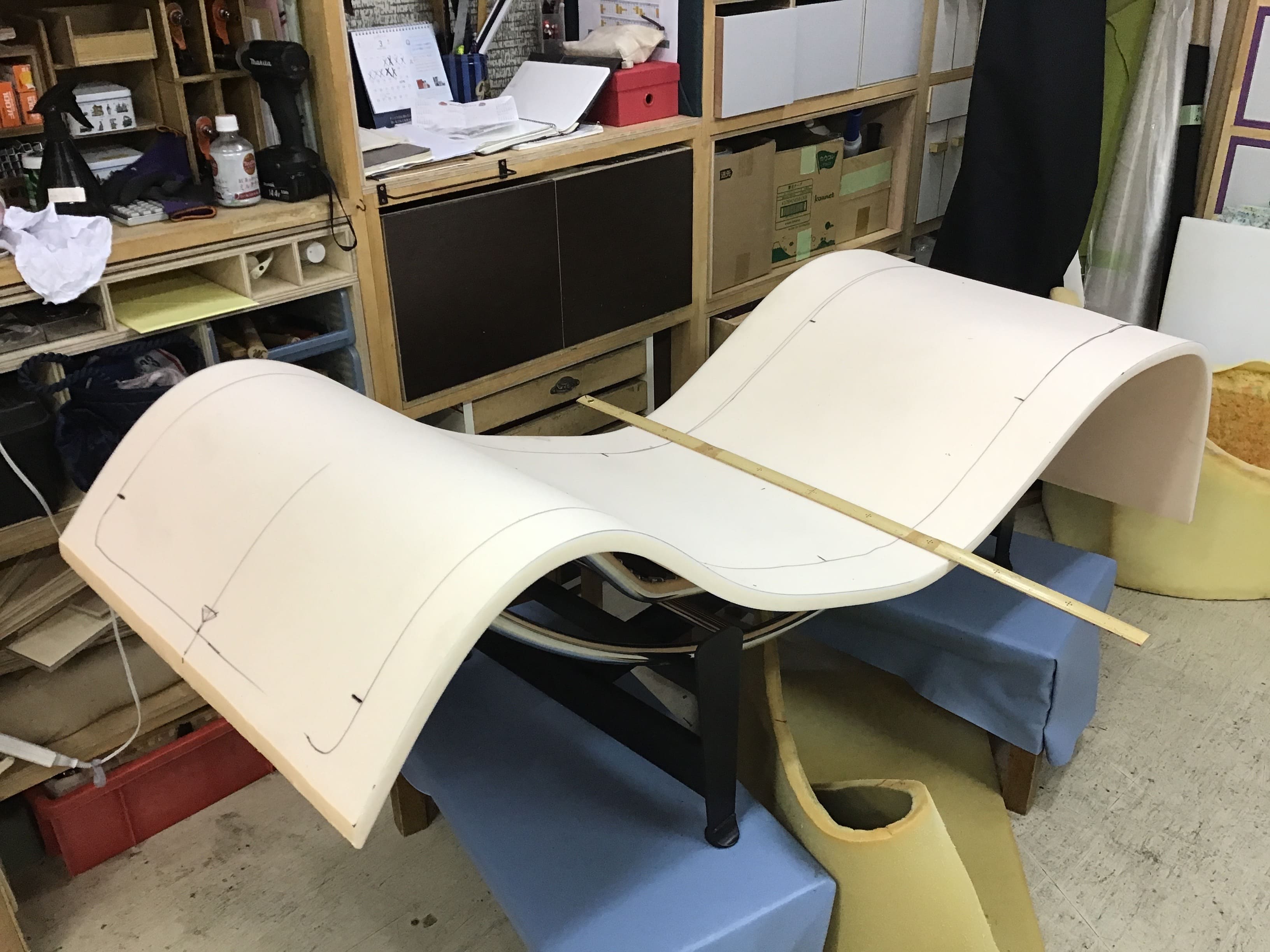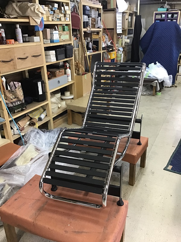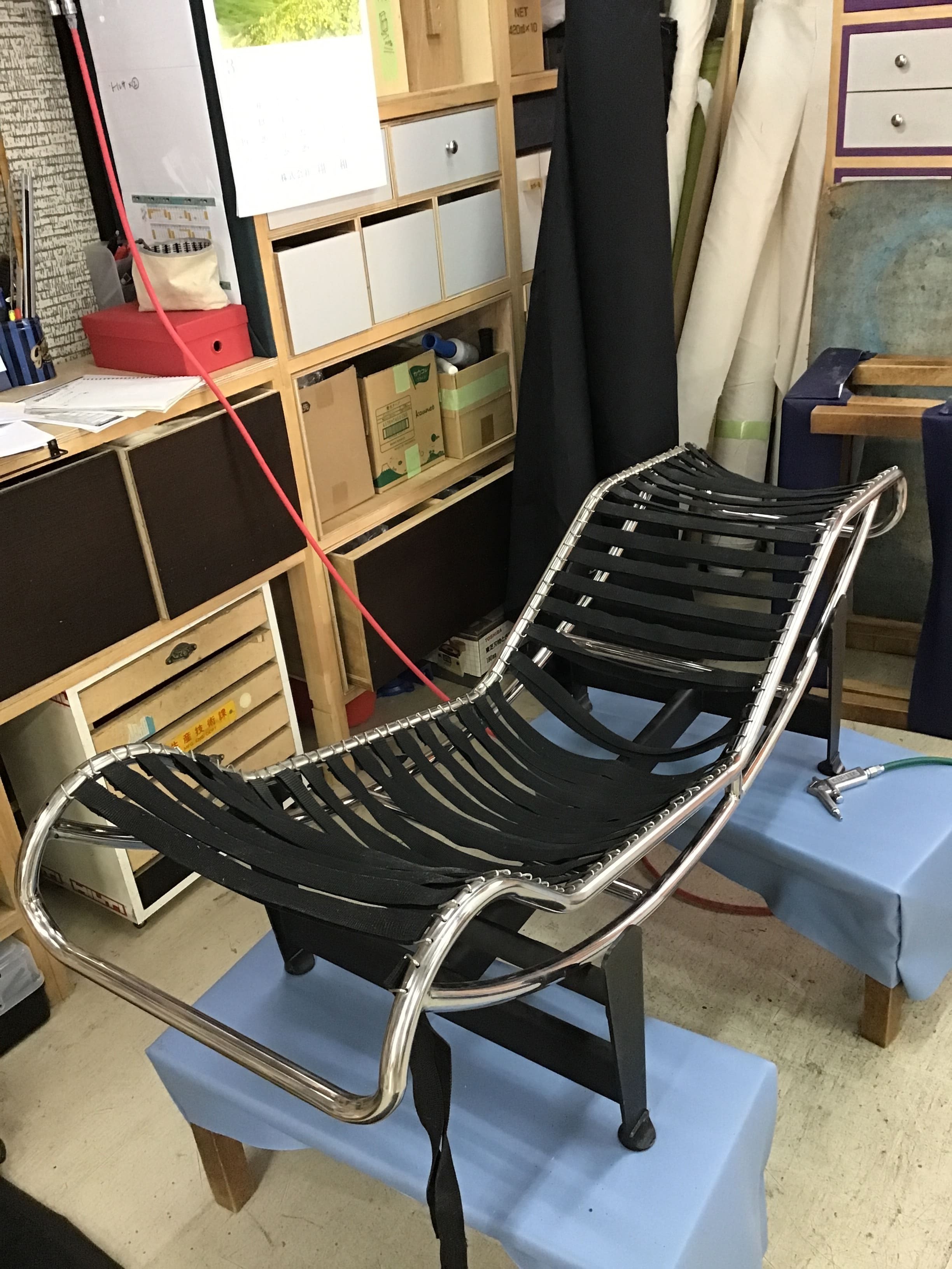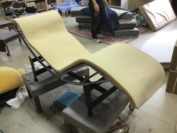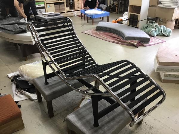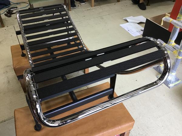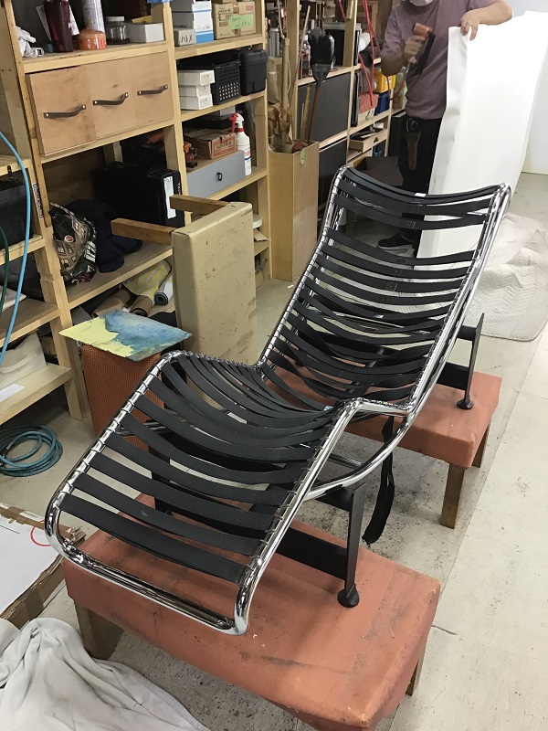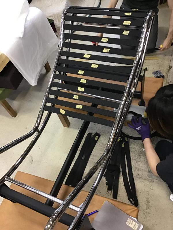 ル・コルビジェLC4シェーズロング ベルト交換とクッションの交換ベルトは製作地より輸入し交換しています。ウレタンは従来より厚さを10mm増し密度の高いウレタン材を使用するため、パイプフレームに合わせ成形しています。
