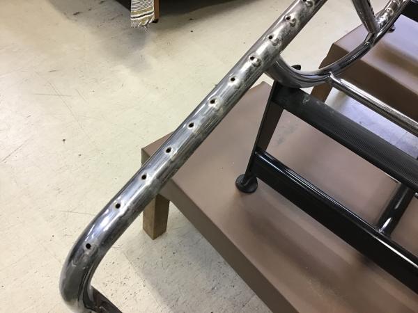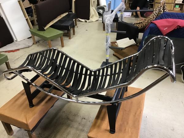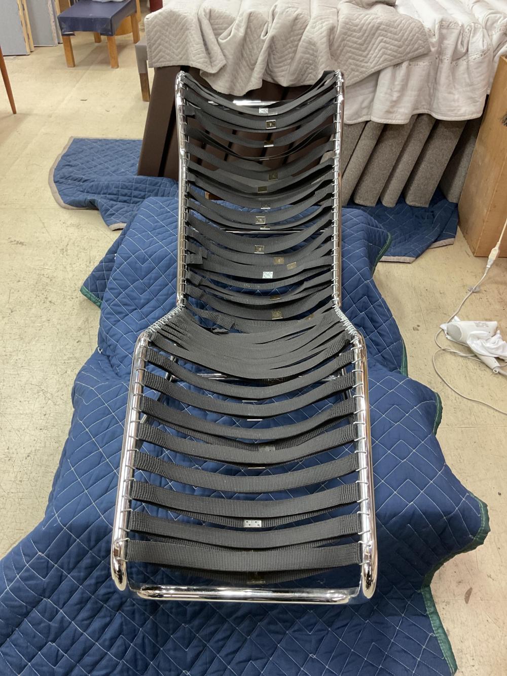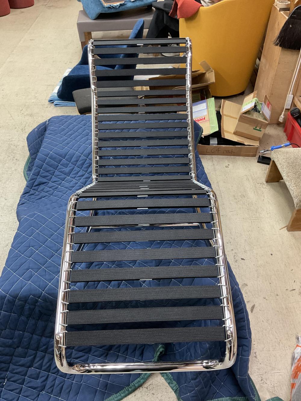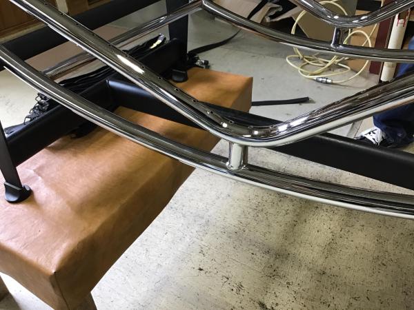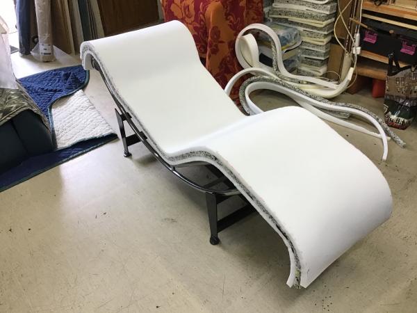 ル・コルビジェLC4シェーズロング ベルト交換とクッションの交換ベルトは製作地より輸入し交換しています。ウレタンは従来より厚さを10mm増し密度の高いウレタン材を使用するため、パイプフレームに合わせ成形しています。