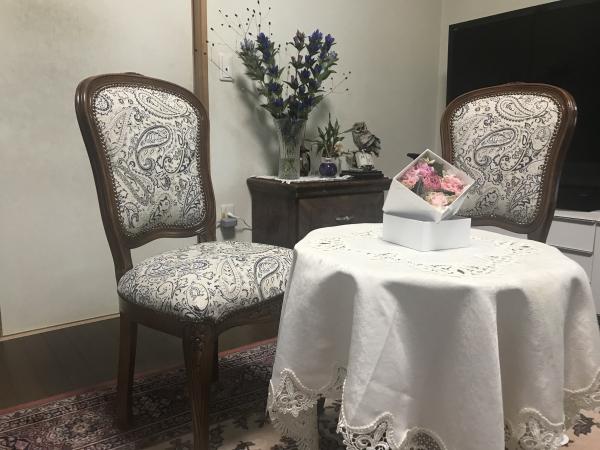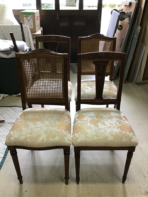 椅子の張替え、ありがとうございました。想像以上の綺麗な仕上がりです。特に4脚の方は、25年以上前結婚した時のものなので、また、使用できて、本当に嬉しいです。柄ゆきも4脚綺麗に揃えてくださって、丁寧なお仕事に、お願いして、本当に良かったです。ありがとうございました。