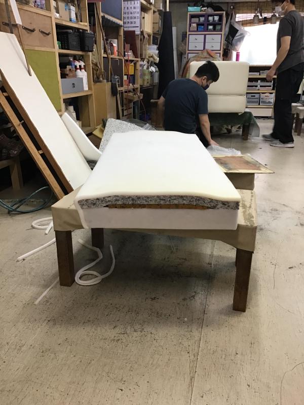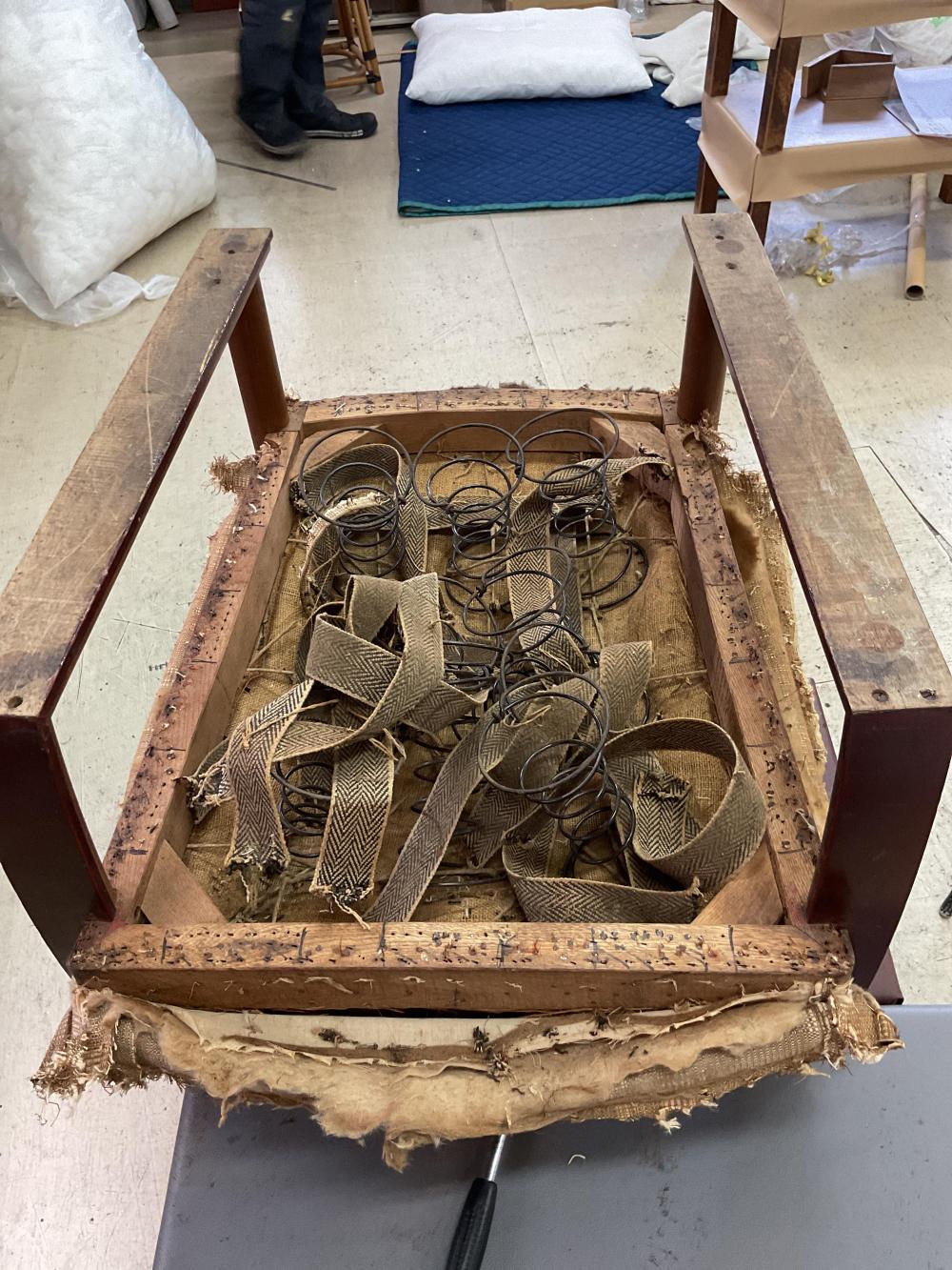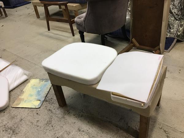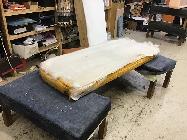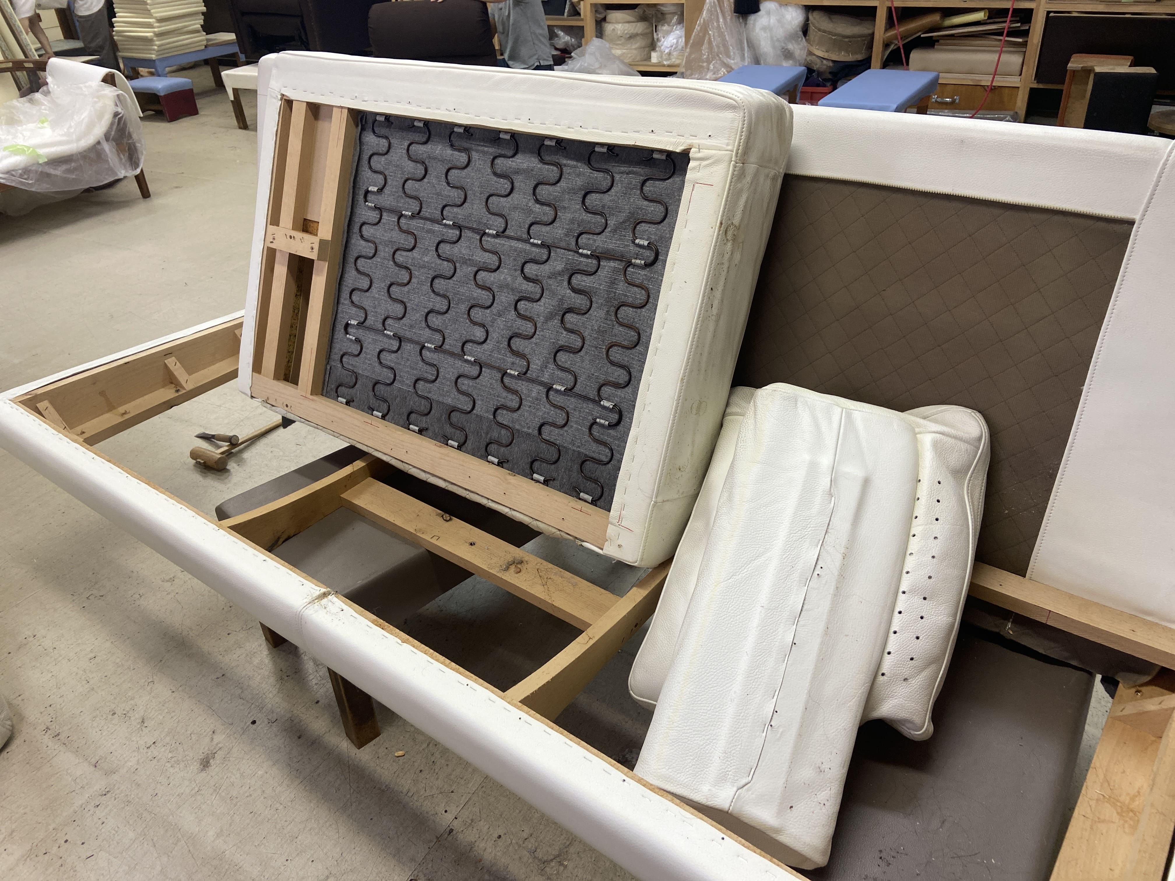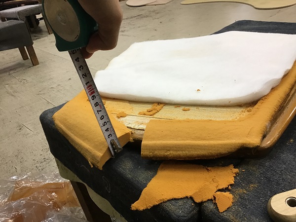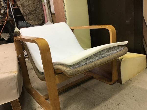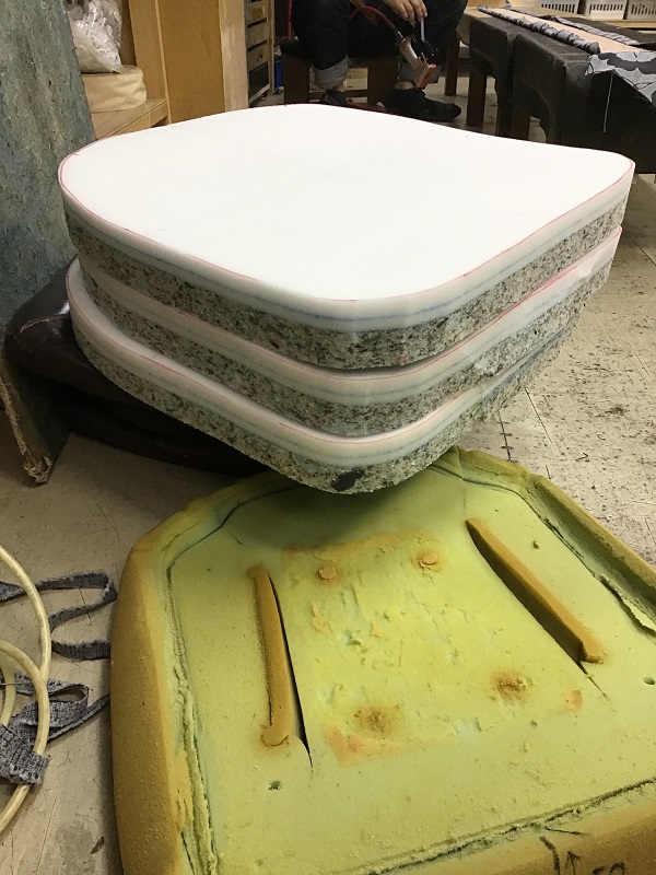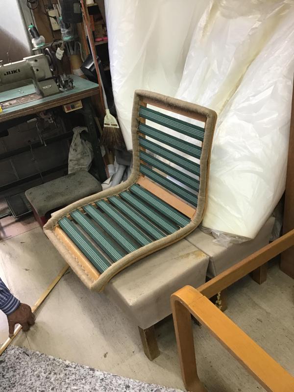 座面中のエラスベルトが伸び切ってしまい、底抜けしているような状態なので、交換の対応と、ウレタン材の交換をし張替ました。
