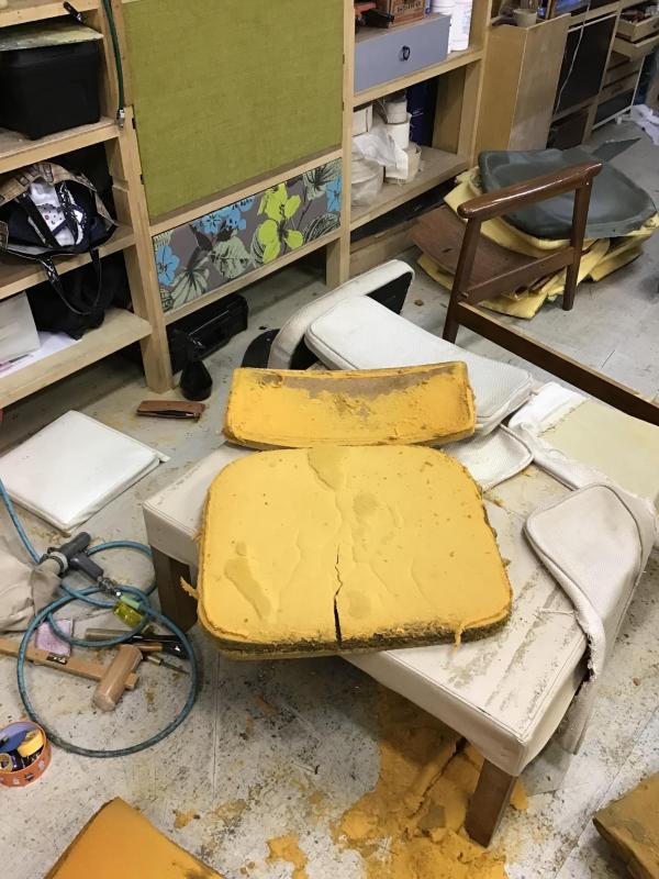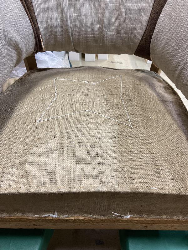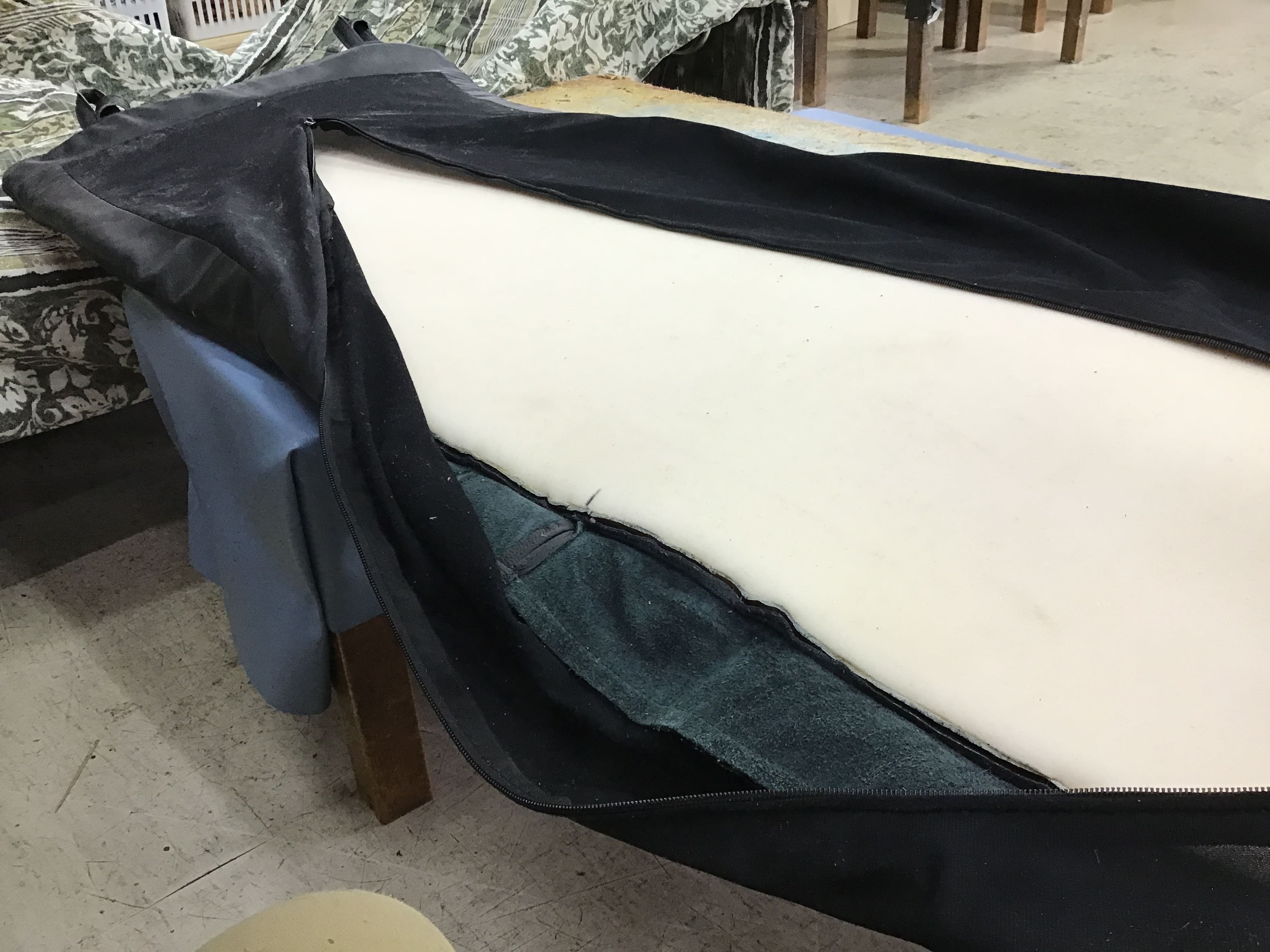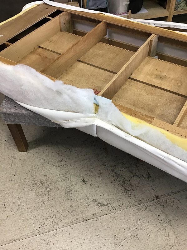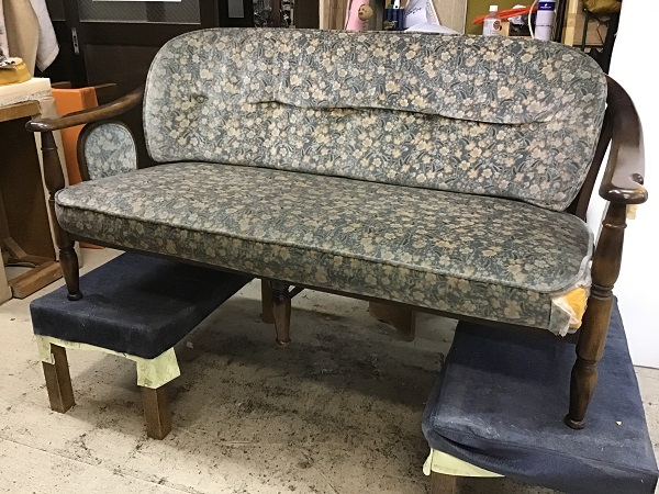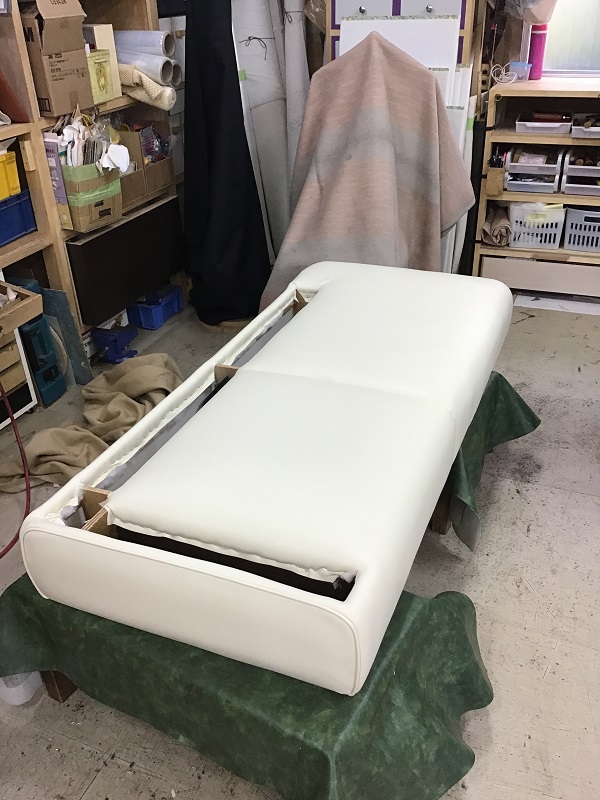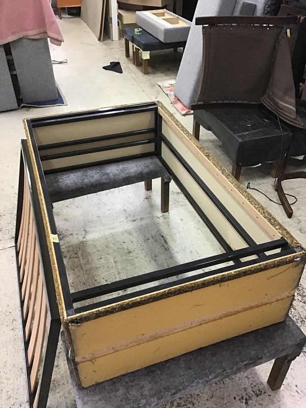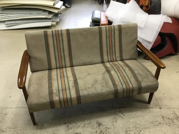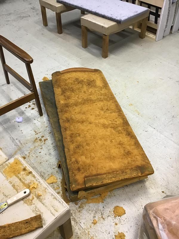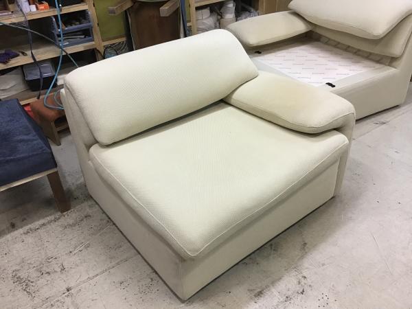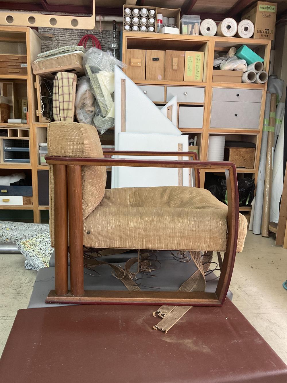 座面中のエラスベルトが伸び切ってしまい、底抜けしているような状態なので、交換の対応と、ウレタン材の交換をし張替ました。