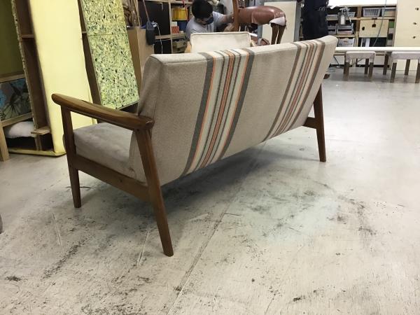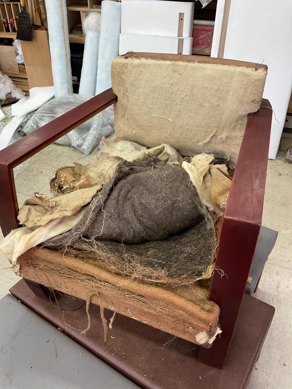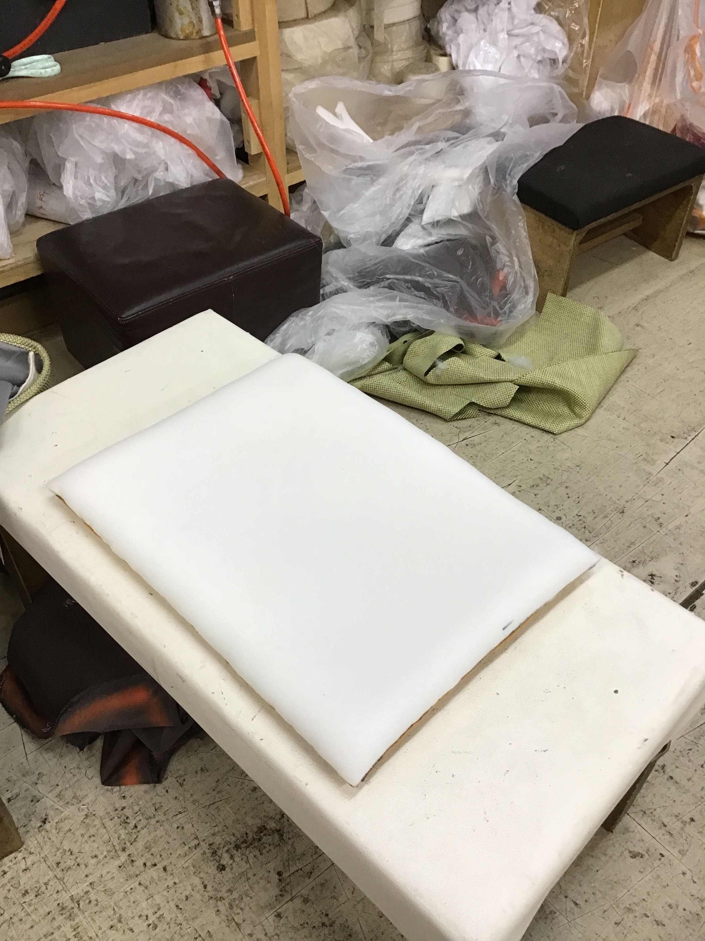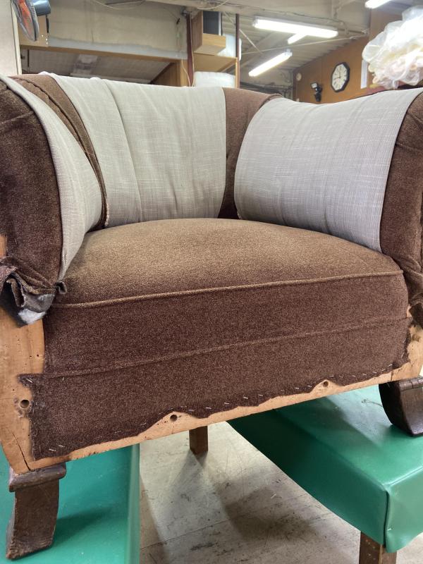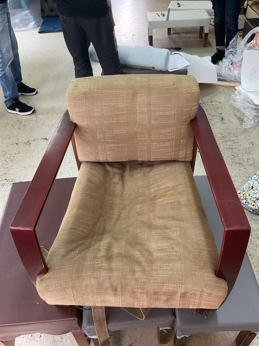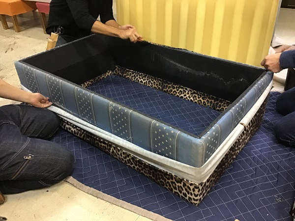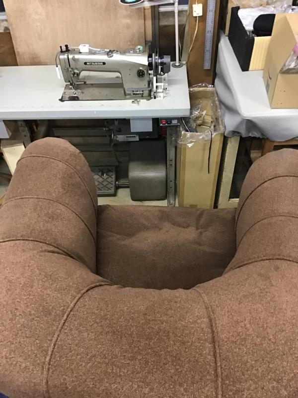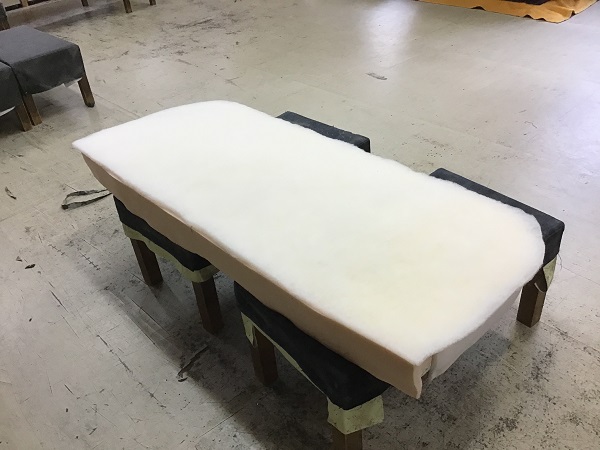 座面中のエラスベルトが伸び切ってしまい、底抜けしているような状態なので、交換の対応と、ウレタン材の交換をし張替ました。