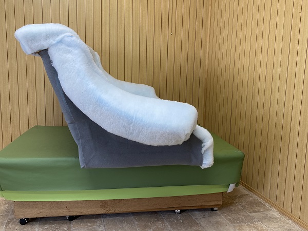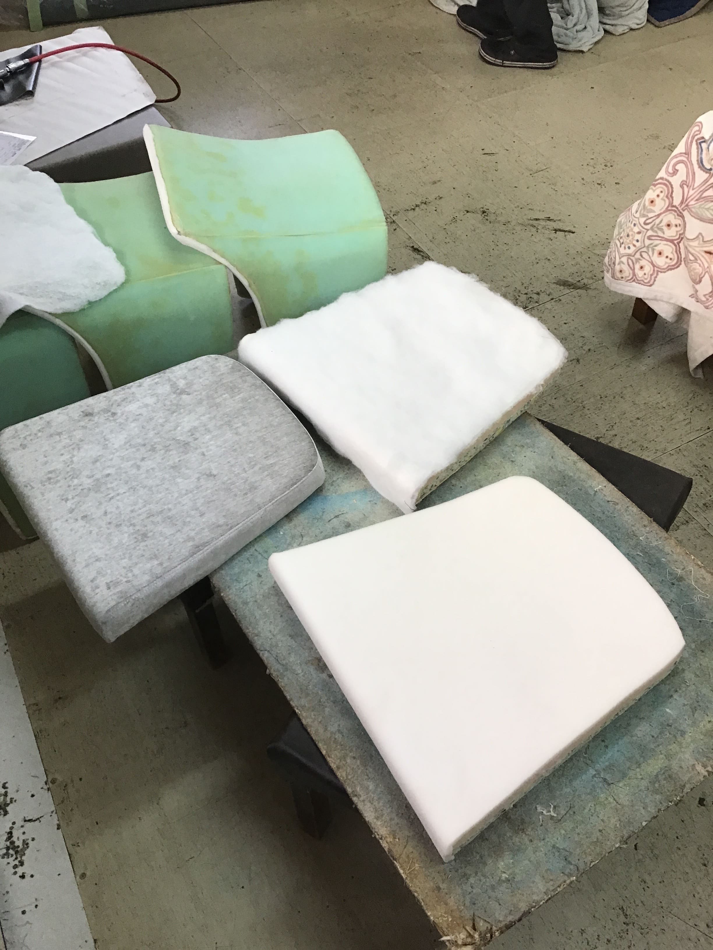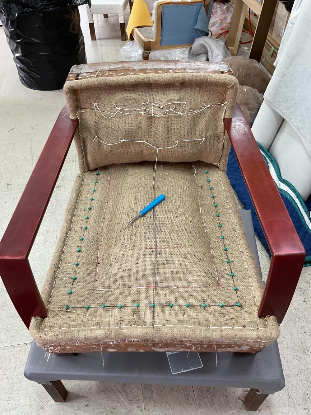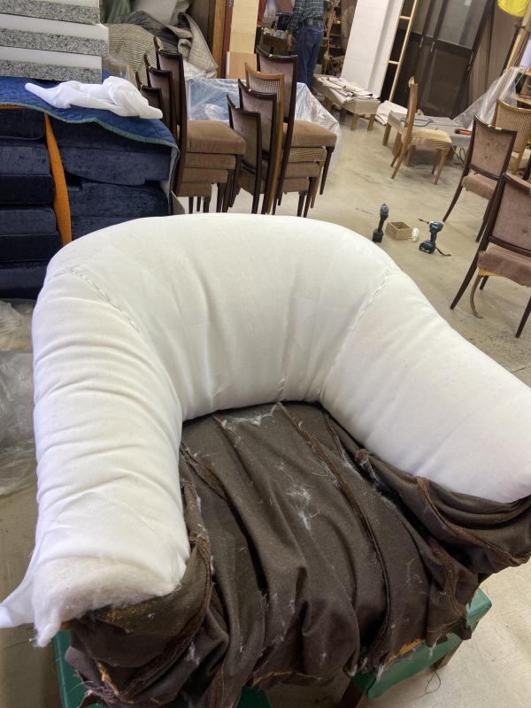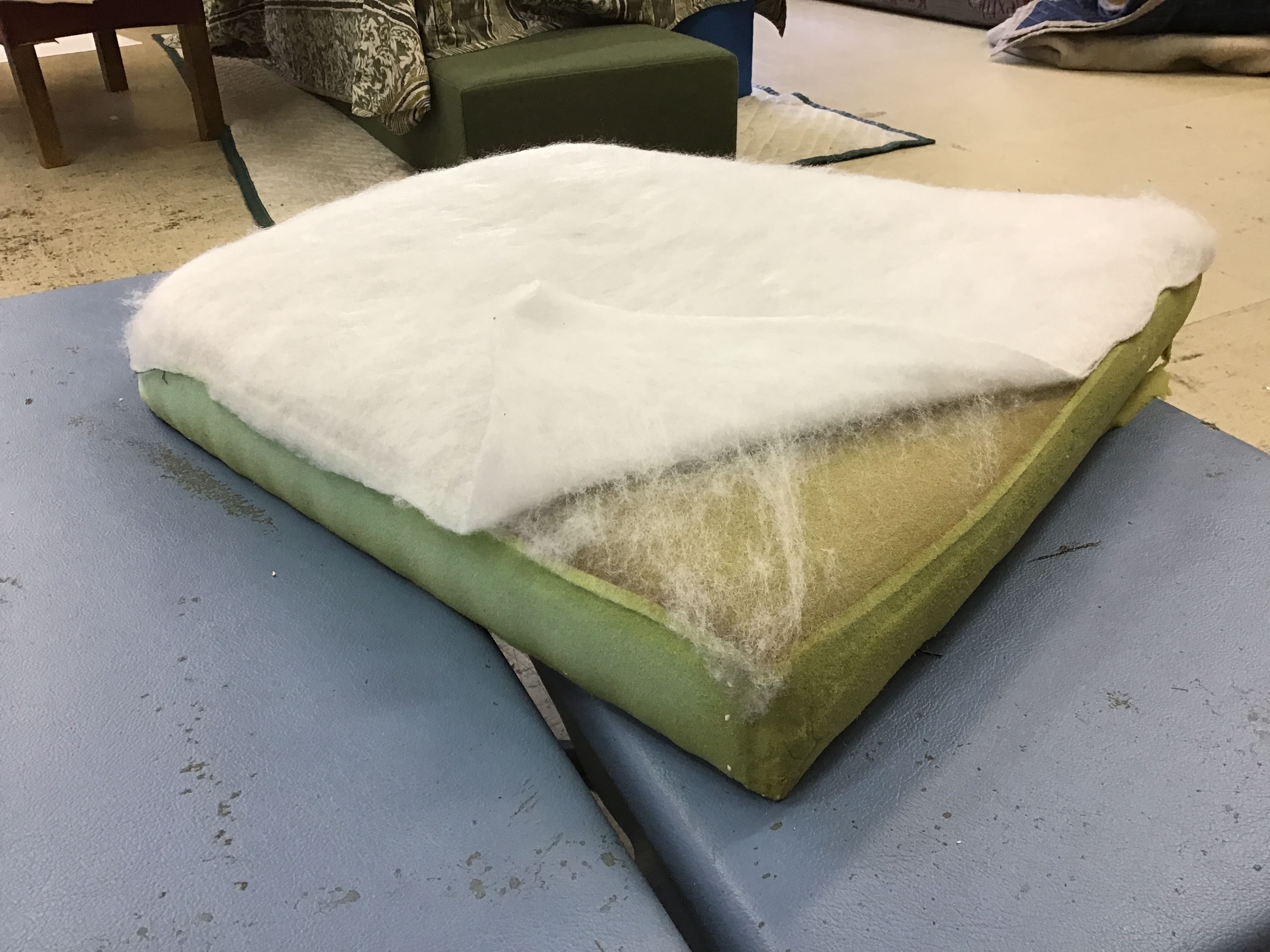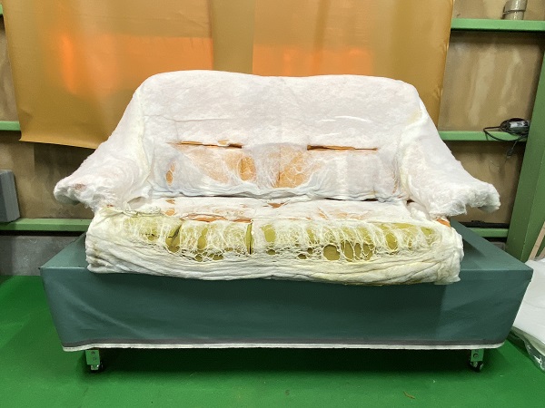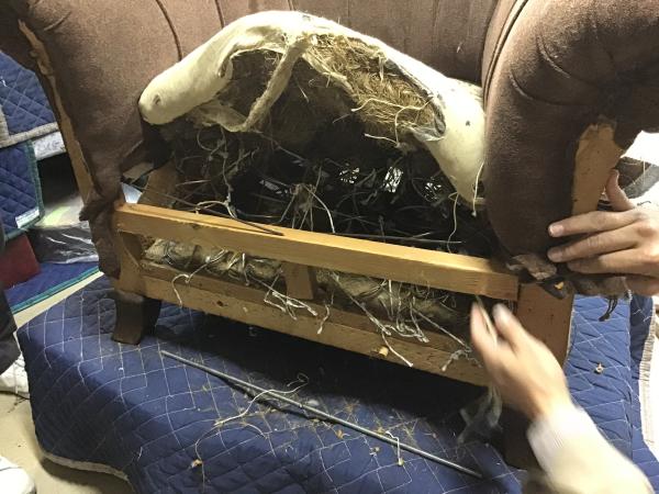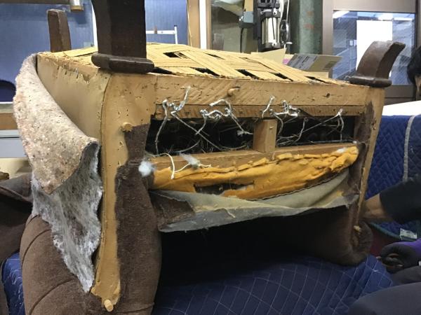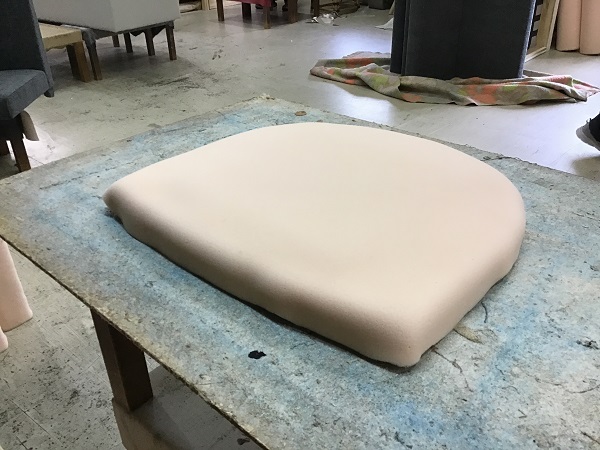 座面中のエラスベルトが伸び切ってしまい、底抜けしているような状態なので、交換の対応と、ウレタン材の交換をし張替ました。