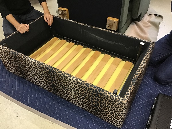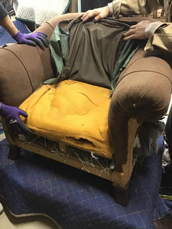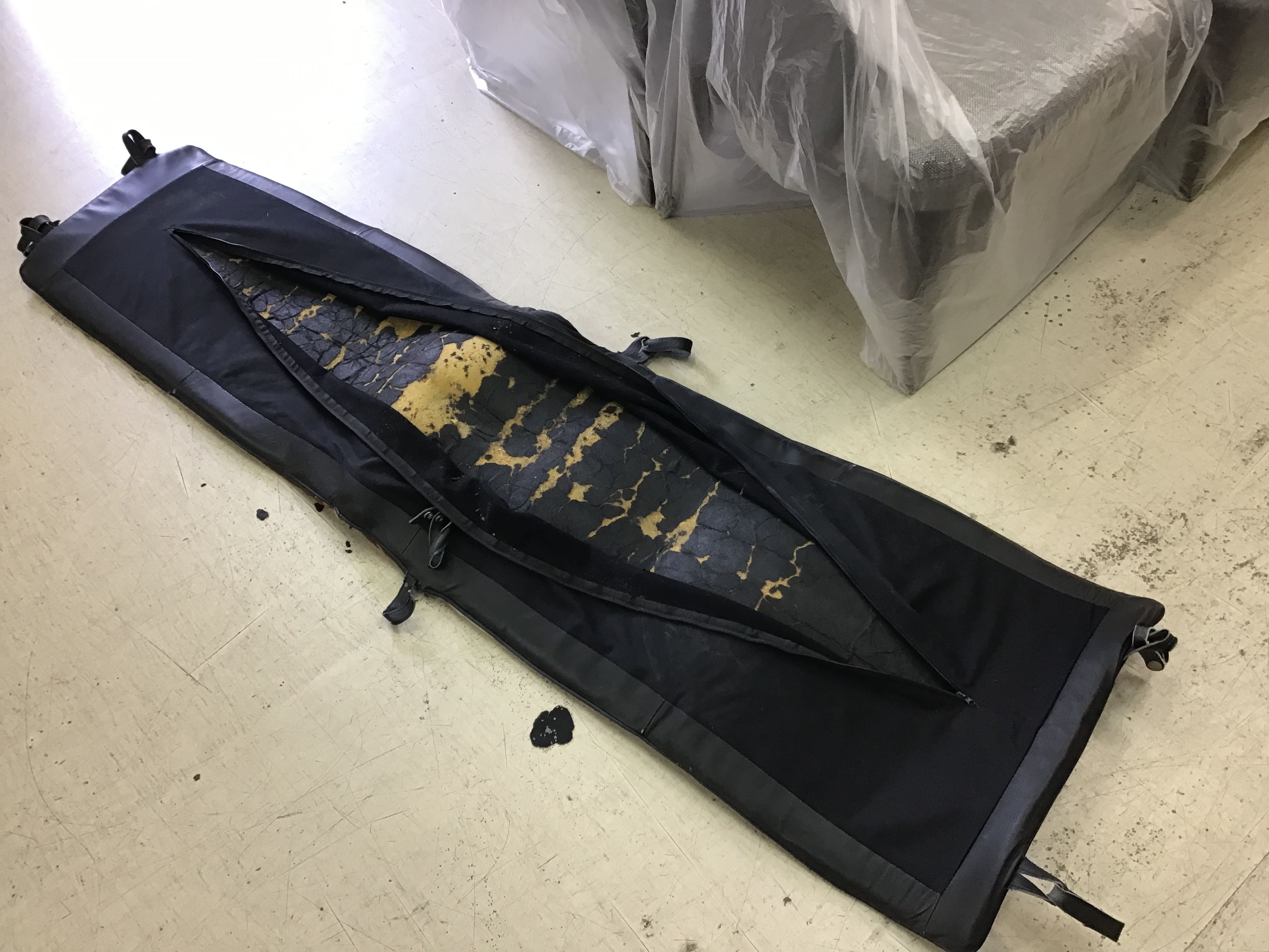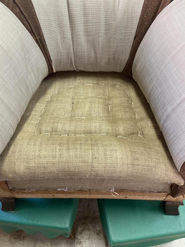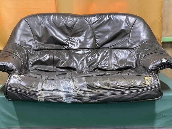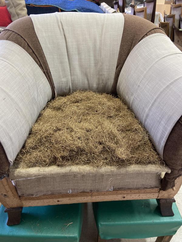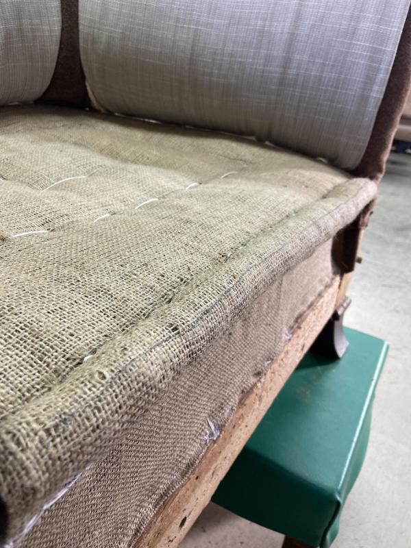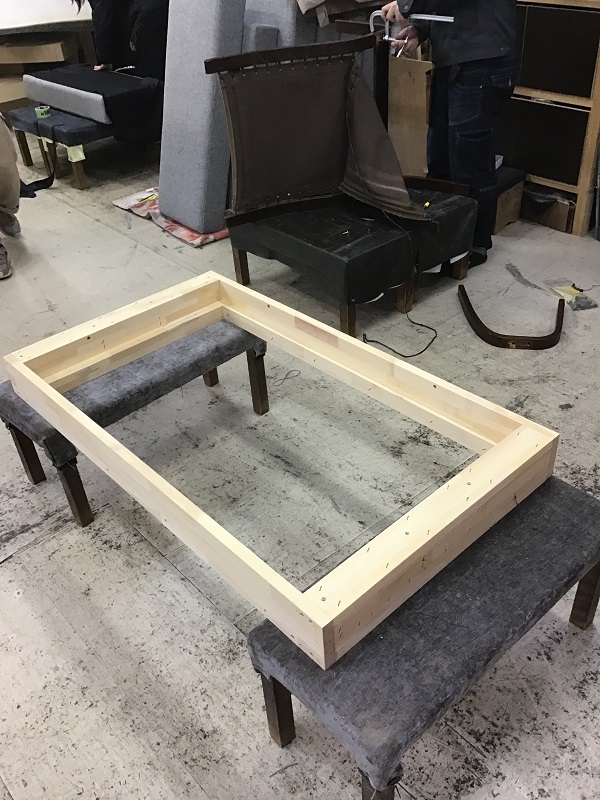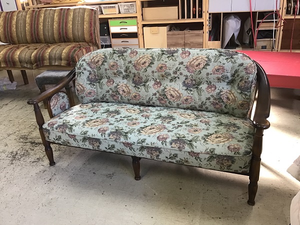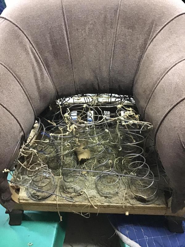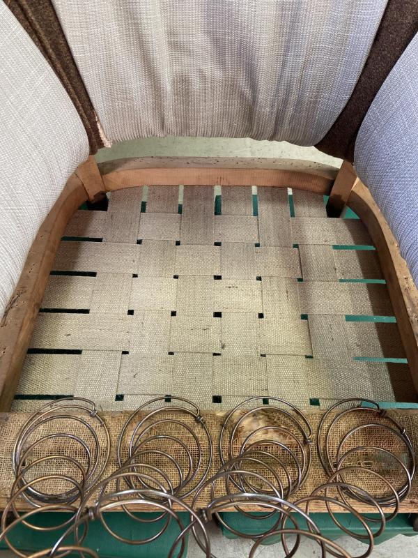 座面中のエラスベルトが伸び切ってしまい、底抜けしているような状態なので、交換の対応と、ウレタン材の交換をし張替ました。